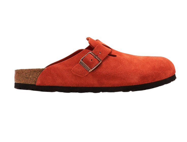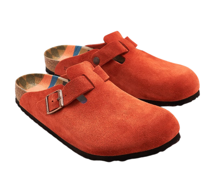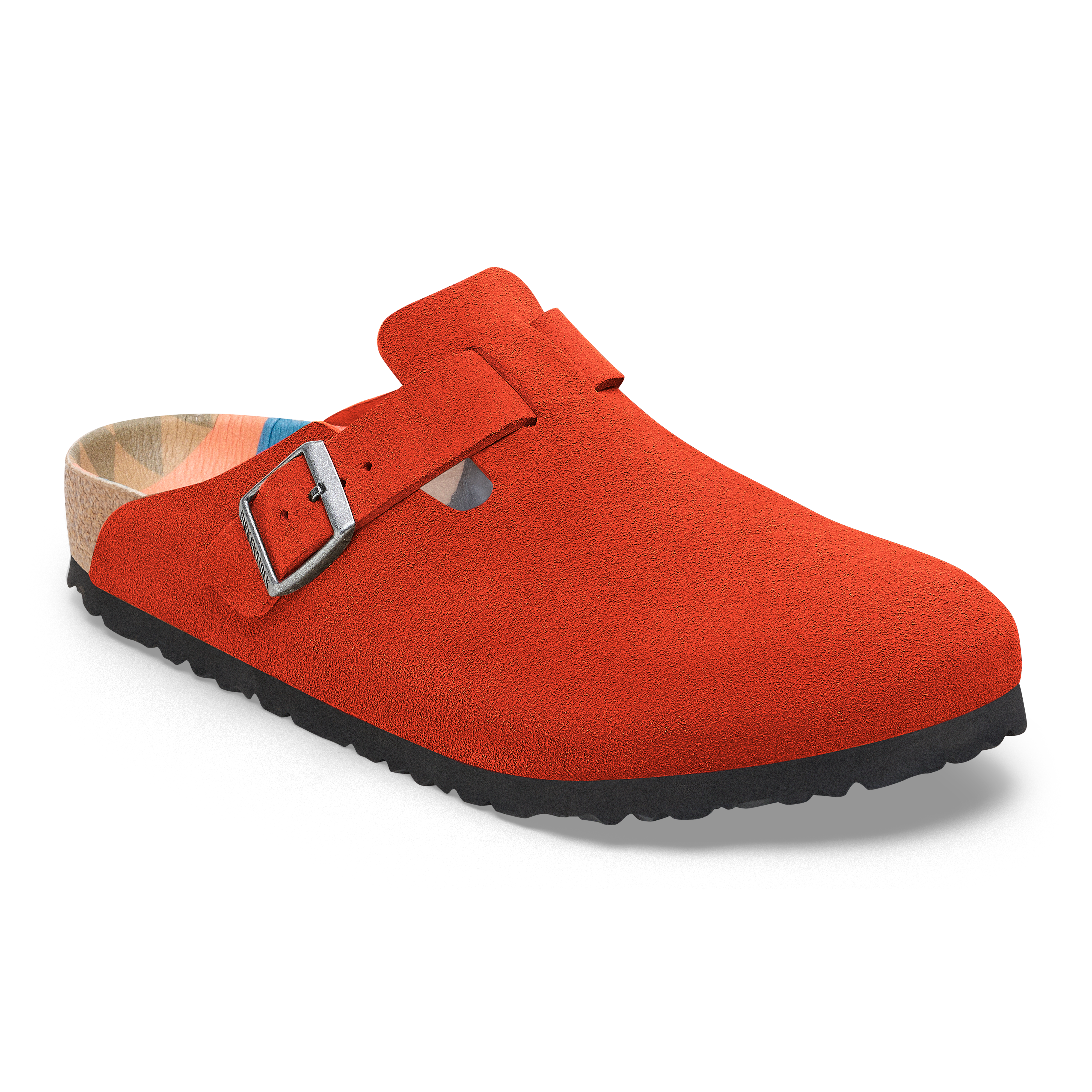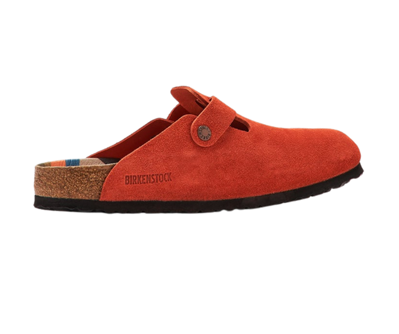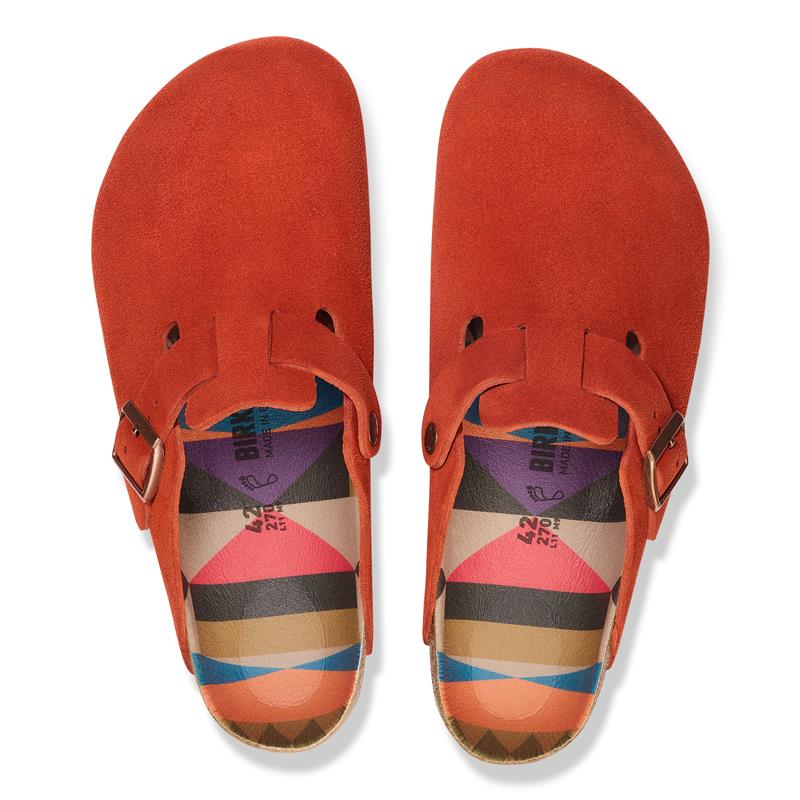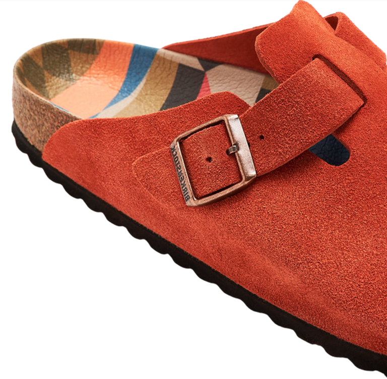 The BIRKENSTOCK Boston clog is a classic shoe perfect for all year wear. Comfortable yet still stylish, this version features a graphic pattern on the footbed and color-coordinated buckles with a textile feel and a matte design. The upper is made from especially soft suede.