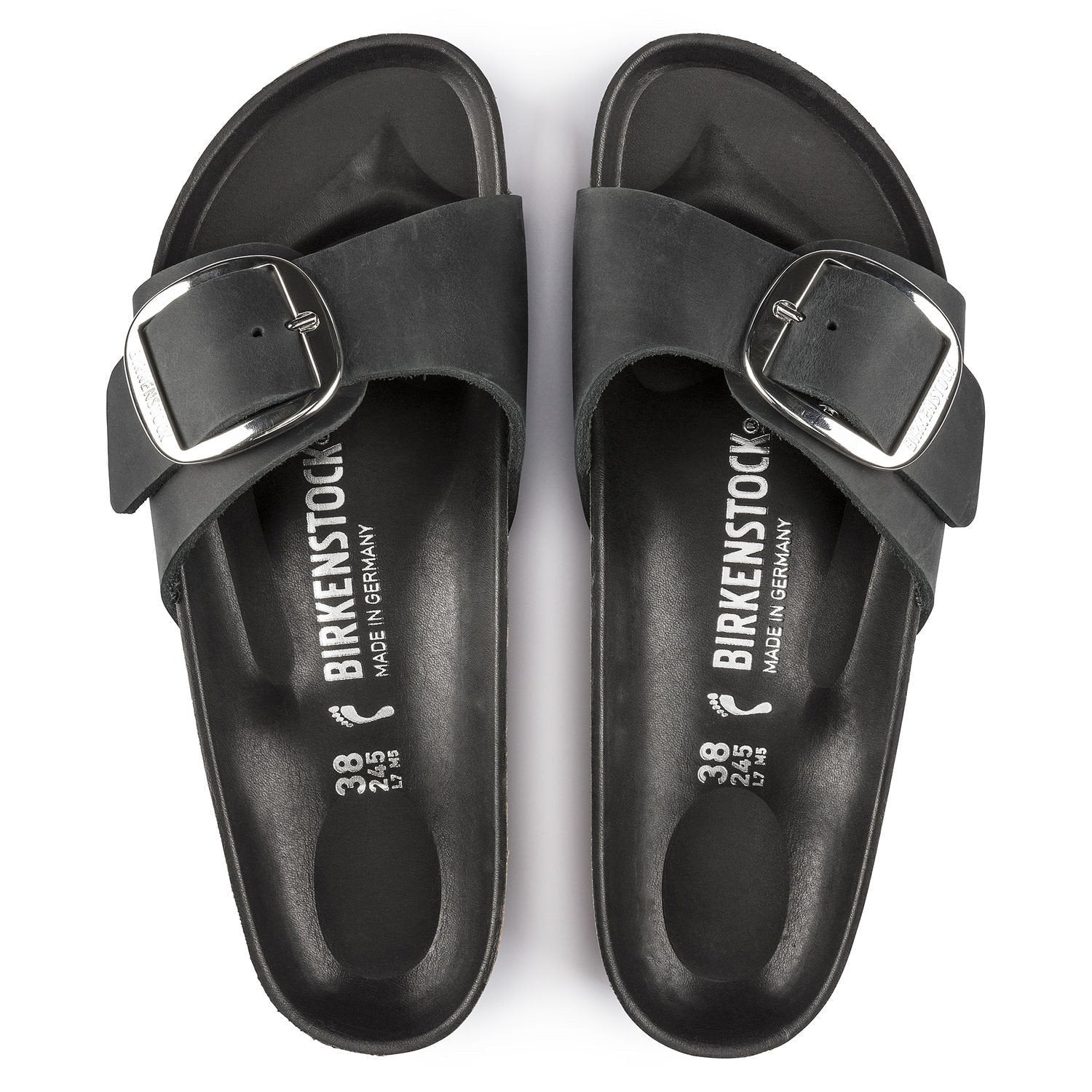 A strap, a buckle and a contoured cork footbed are masterfully combined to create the original Birkenstock sandal - the Madrid. An iconic slide with amplified buckle accent. Shown in oiled nubuck leather.