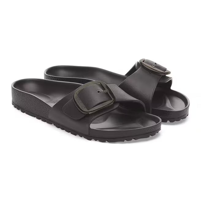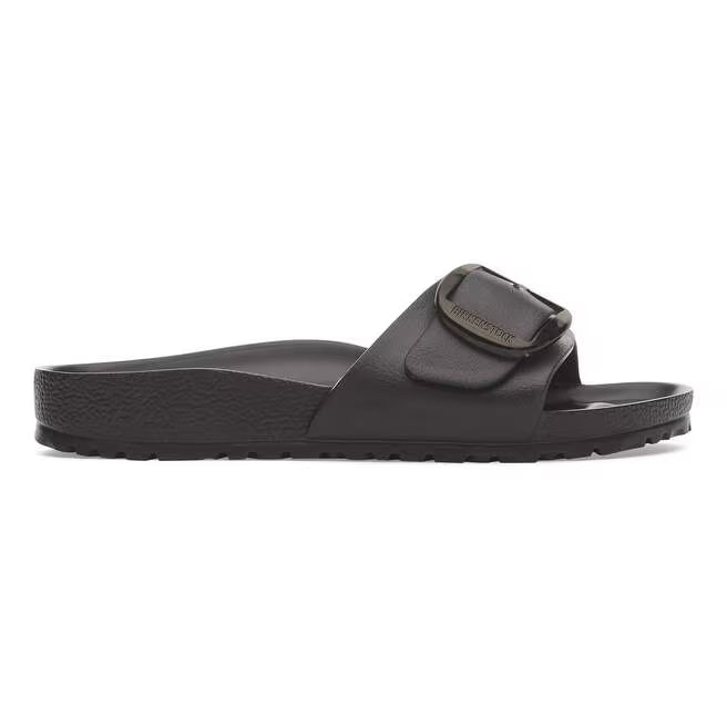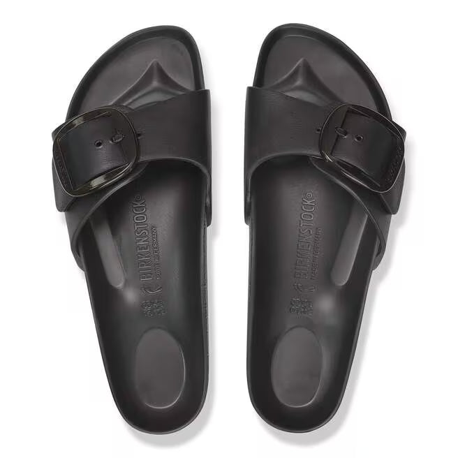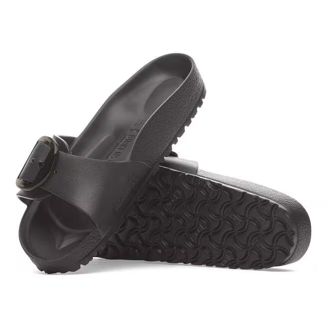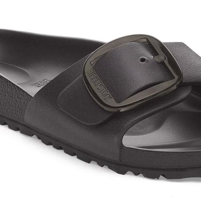 This is a new and modern interpretation of the BIRKENSTOCK classic Madrid. This version features our popular Big Buckle made from a stainless synthetic material and makes an impression with its durability and minimalist design. Modeled on the cork sandal, it is made from the ultra-lightweight and highly flexible synthetic material EVA. The high-quality, odor-neutral EVA has been tested for harmful substances and combines numerous positive attributes: it is very light, highly elastic, shock-absorbent, water-resistant, and skin-friendly.