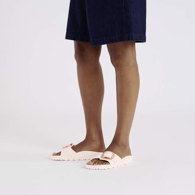 This is a new and modern interpretation of the BIRKENSTOCK classic Madrid. This version features our popular Big Buckle made from a stainless synthetic material and makes an impression with its durability and minimalist design. Modeled on the cork sandal, it is made from the ultra-lightweight and highly flexible synthetic material EVA. The high-quality, odor-neutral EVA has been tested for harmful substances and combines numerous positive attributes: it is very light, highly elastic, shock-absorbent, water-resistant, and skin-friendly.