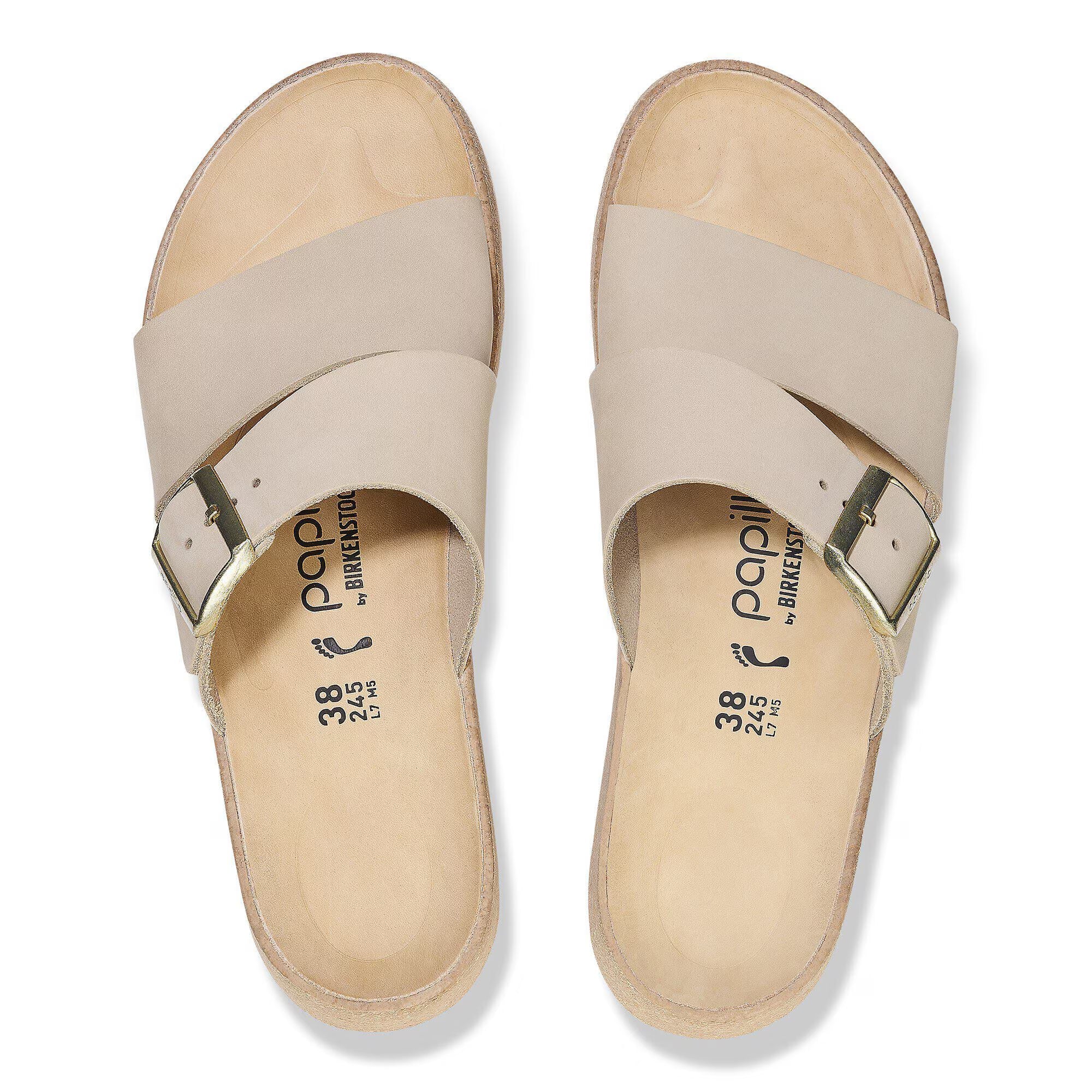 The Almina sandal from Papillio is a platform sandal with a with a slight, flared wedge heel. Its optimum stability thanks to the wide strap at the instep makes it a real hit with women who want both high fashion and comfort. The combination of the natural texture of the raffia and the smooth leather creates a unique summer look.